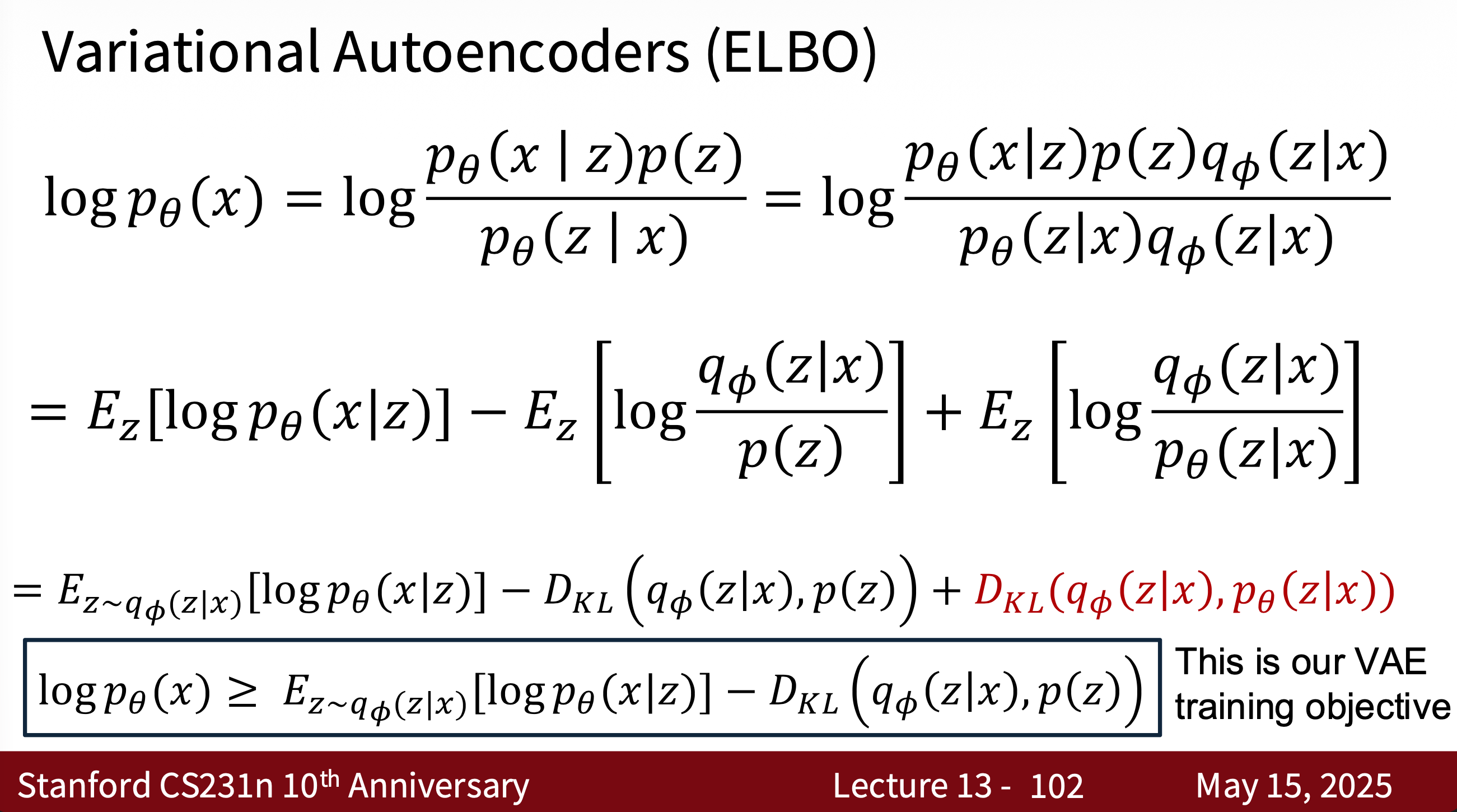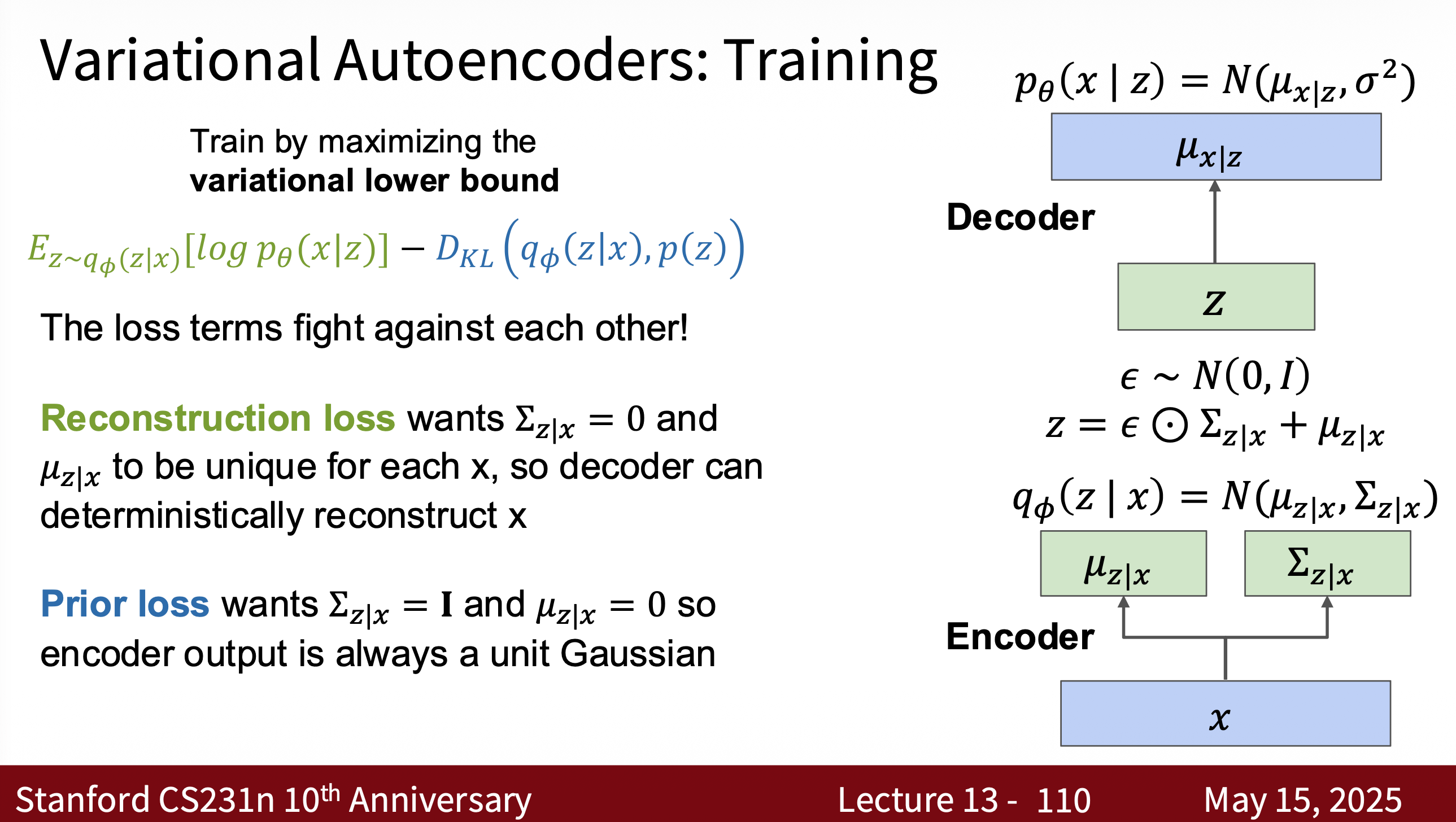 - Goal (ELBO): \(\mathcal{L}(\theta, \phi; x) = \mathbb{E}_{q_\phi(z \mid x)}[\log p_\theta(x \mid z)] - \text{KL}(q_\phi(z \mid x) \| p(z))\)