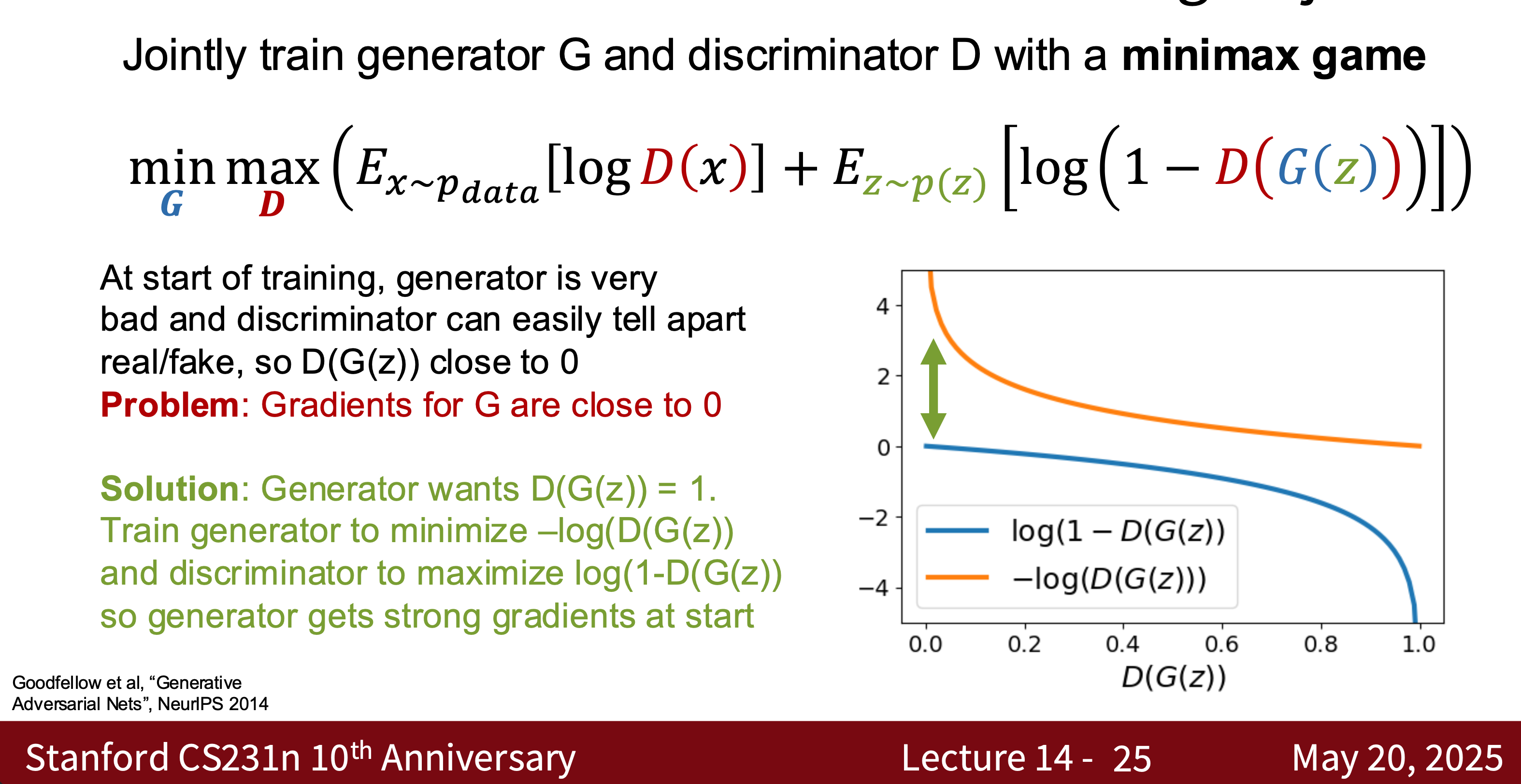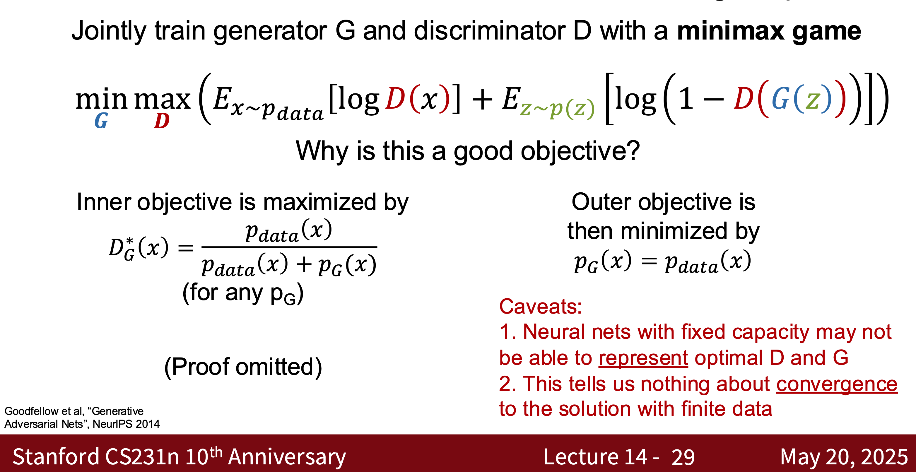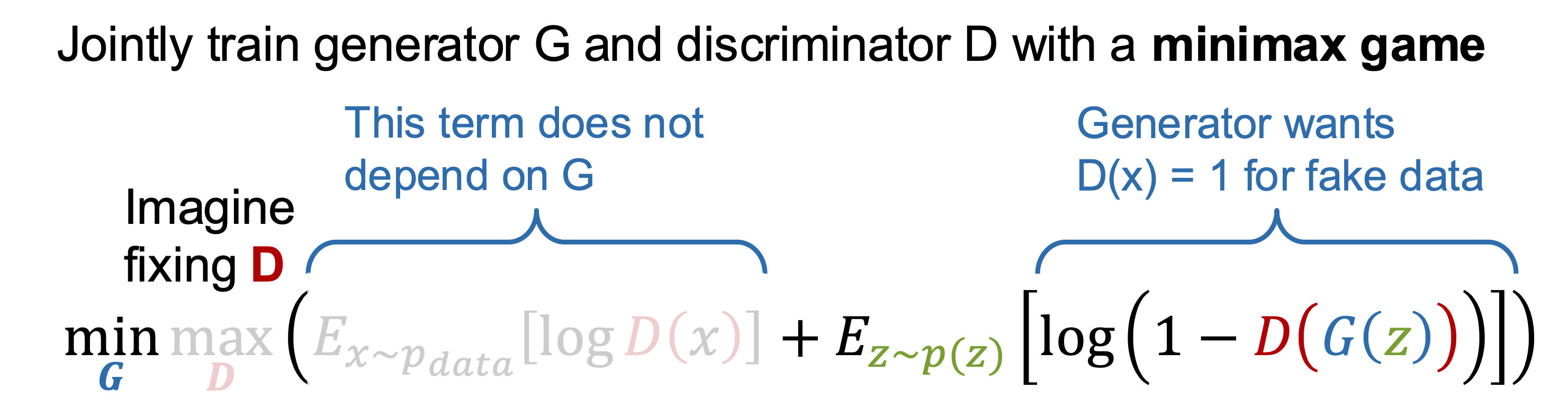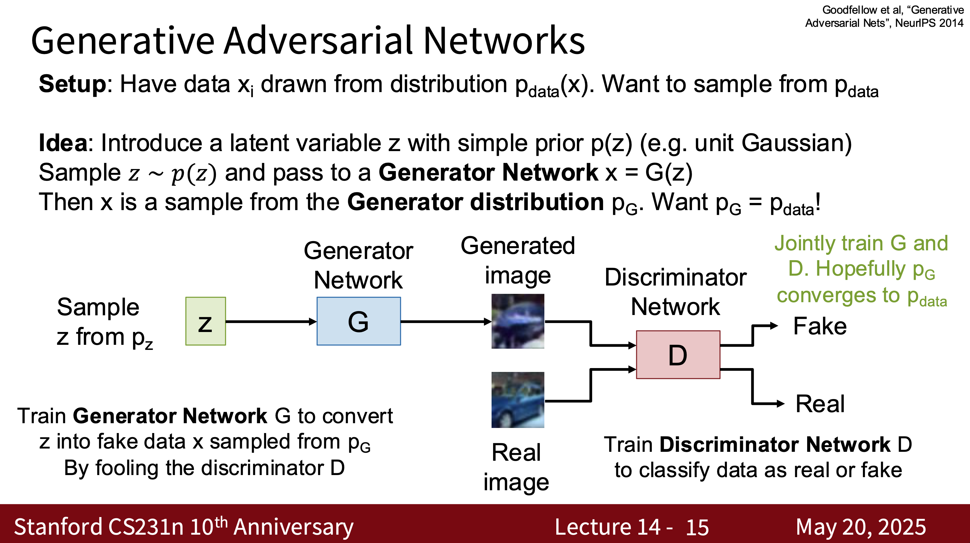 - Goal: \(\min_G \max_D \mathbb{E}_{x \sim p_\text{data}}[\log D(x)] + \mathbb{E}_{z \sim p_z}[\log (1 - D(G(z)))]\)