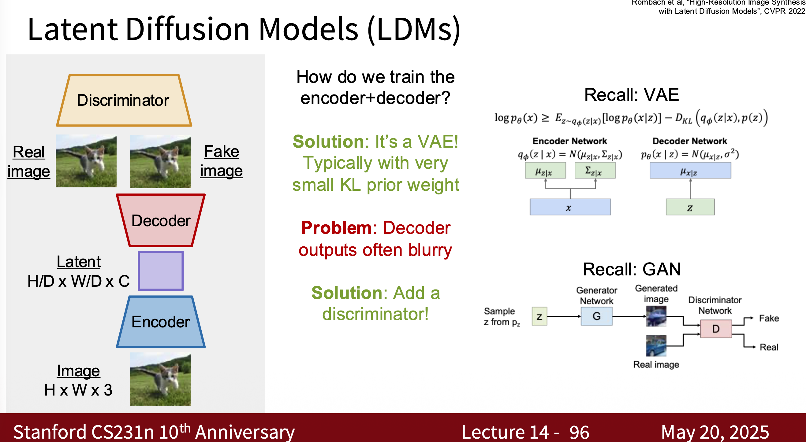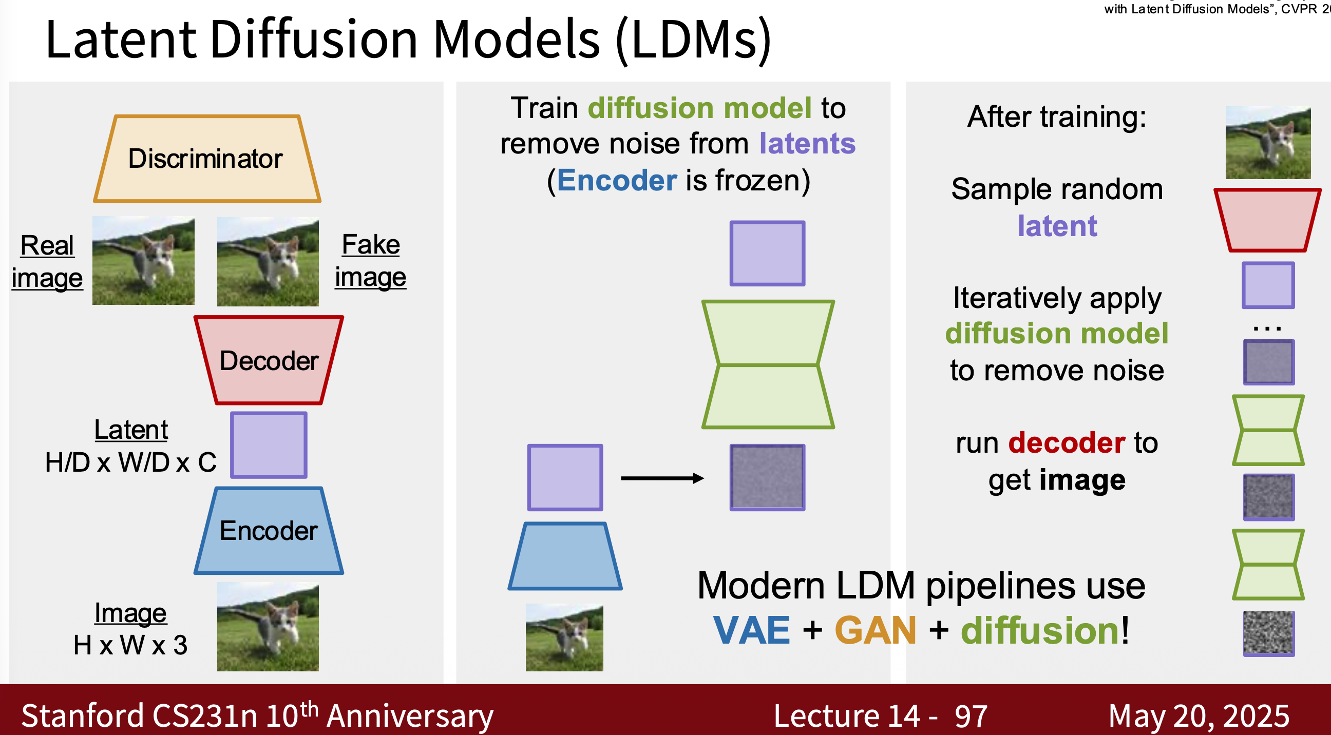 - Modern Diffusion Model The most common one is Latent Diffusion Model (LDM) is essentially a combination of VAE, GAN, and Diffusion. Why? Because using modern diffusion models for tasks requires high-quality, well-generated data, which is the advantage of GANs. They can quickly generate latent spaces, which is the advantage of VAEs.